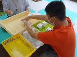 ワーキングセンターいづみで製造・販売している「茶処ラスク」のバーコードを、正しい位置に正確に貼ることを練習しています。商品を丁寧に扱う・場所やゆがみに注意して貼る・作業が終了したらスタッフに報告をする等、社会の一員としての役割を意識しながら活動しています。