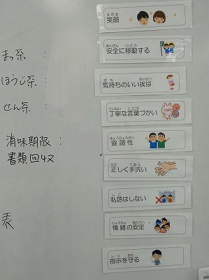 現在は、「道の駅 お茶の京都みなみやましろ村」へ「茶処ラスク」の納品に行っています。「商品運搬」「商品補充」「書類回収」「賞味期限チェック」という仕事内容を児童同士で話し合いをして役割を決め、担当します。